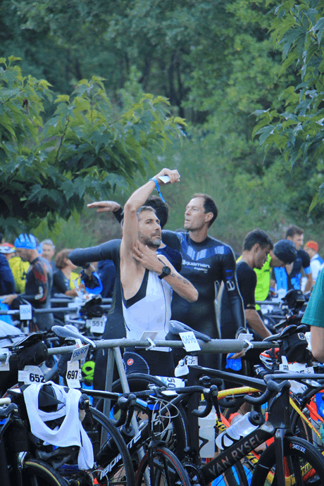 1er couac, les consignes n’ont pas été très claires. Je pensais qu’il y avait une consigne pour nos sacs, en fait pas du tout. Ce qu’ils ont appelé le sac d’après-course est en fait le seul avec lequel nous sommes autorisés à pénétrer sur le parc de transition.